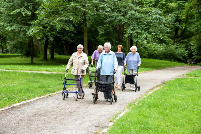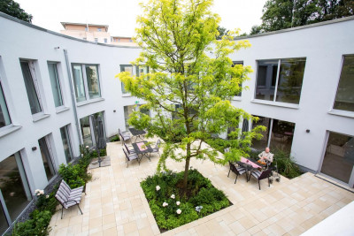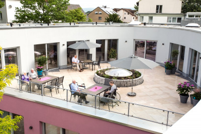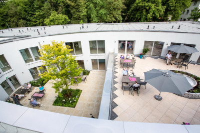 Immer in Bewegung bleiben – dazu animiert nicht nur der angrenzende Kurpark. Auch der innenliegende Rundlauf mit seinem Blick auf die beiden Terrassen lädt zu einer gemütlichen Spazierrunde ein. Und als Auszeit gibt es dann Kaffee und Kuchen in netter Gesellschaft auf der Sonnenterrasse.